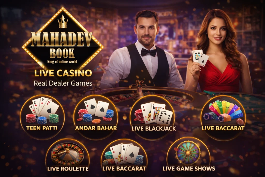 Mahadev Book Live Casino is an online live casino platform that offers real dealer games like Teen Patti, Andar Bahar, Blackjack, Roulette, Baccarat, and live game shows through HD streaming.